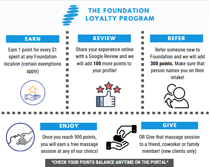The Loyalty Program is a privilege for clients and customers of Foundation Physiotherapy & Wellness.